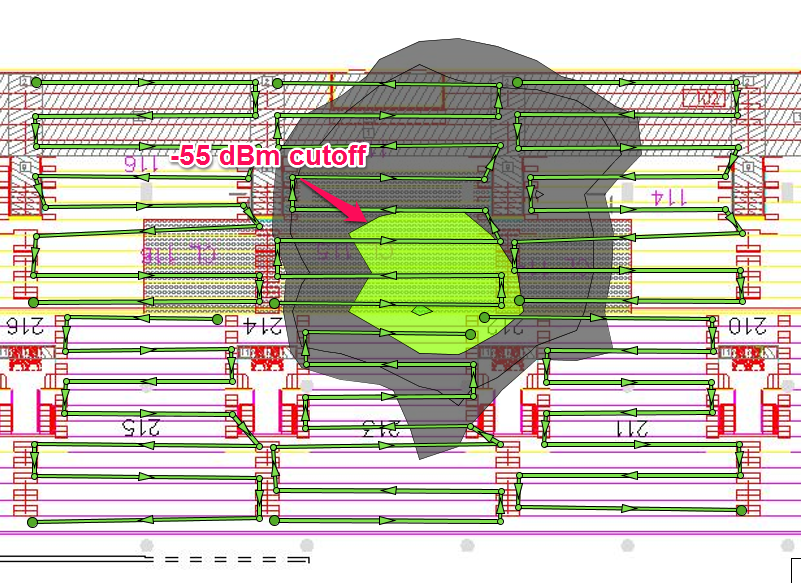 Once you are finished with the survey, filter the results to show only the survey SSID. Then bring your cell size down to a -55 dBm cutoff. I recommend planning for -55 dBm cell sizes in the empty stadium because you can normally count on around 10 dBm of attenuation when the arena is full.